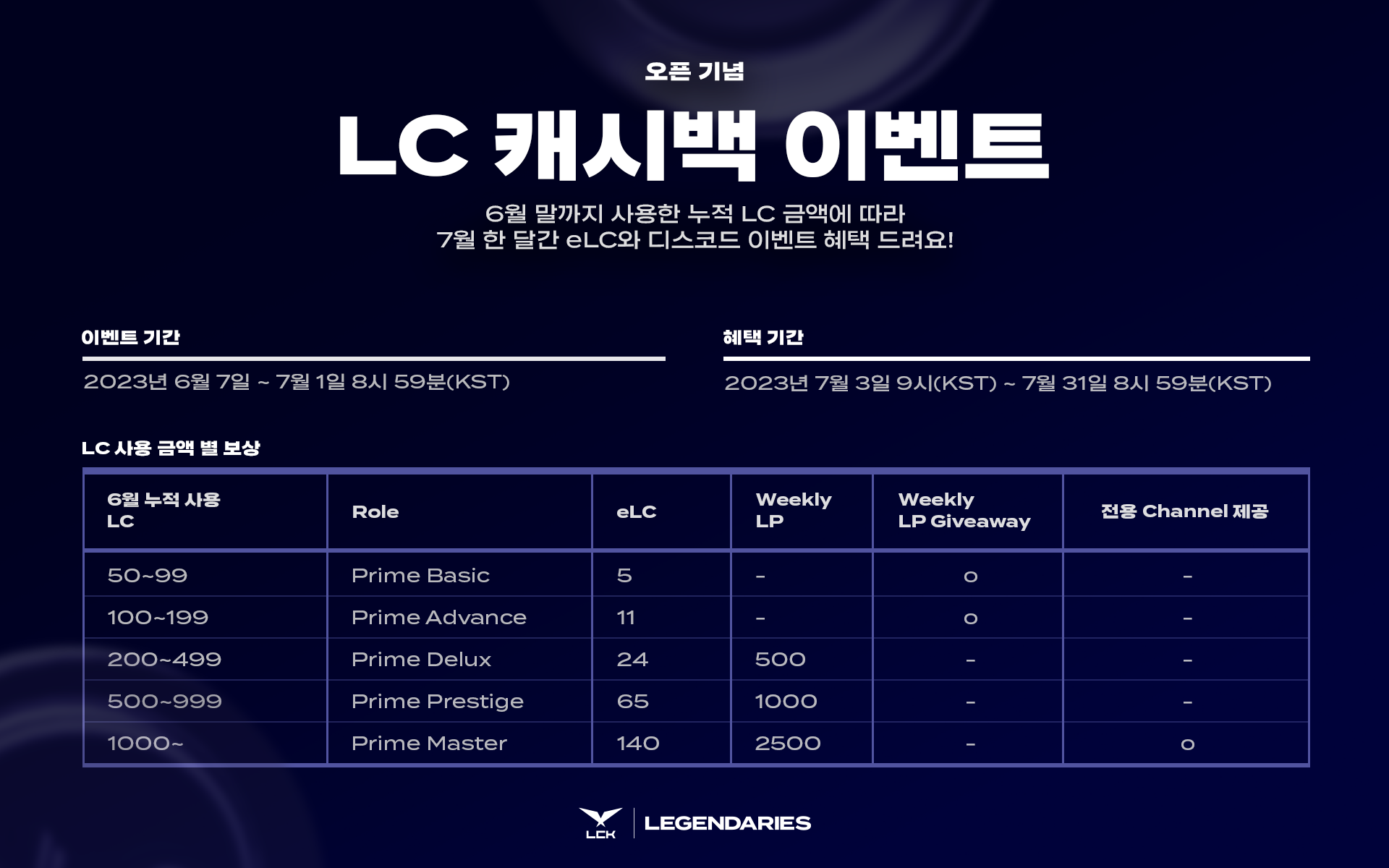 LCK LEGENDARIES 베타 서비스 오픈 기념으로 6월 한달 간 LC 캐시백 이벤트를 진행합니다. 6월 7일 오픈부터 ~ 7월 1일 8시 59분(KST)까지 사용한 누적 LC 금액에 따라 7월 한 달간 eLC와 디스코드 이벤트 혜택을 드립니다. 상세 LC 사용 금액 별 보상은 아래 이미지 내용을 참고해 주시기 바랍니다.